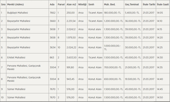 Kayseri Kocasinan Belediyesi Buğdaylı, Beyazşehir, Erkilet, Pervane ve sümer mahallesinde konumlu 10 arsayı 10 milyon 830 bin lira bedelle 10 arsayı satışa çıkarıyor. Arsaların satış ihalesi 21 mart 2017'de gerçekleşecek