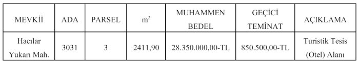 Resmi Gazete’de yer alan bilgiye göre Kayseri’nin Hacılar ilçesinde yer alan Yukarı Mahalle’deki turistik otel, Kayseri Büyükşehir Belediyesi tarafından satışa çıkarılıyor. Değeri 28.350.000 TL olan otelin satışı 25 Haziran Salı günü gerçekleşecek.