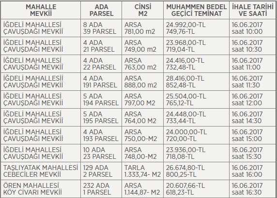 Kiraz Belediyesi İğdeli, Taşlıyatak ve Ören mahallelerinde bulunan 10 adet arsayı ihaleyle satışa çıkardı. İhalesi 16 haziran cuma günü gerçekleşecek