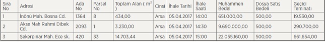 3. Satış ihaleleri 05.04.2017 Çarşamba günü bu ilanın 1. maddesinde belirtilen saatlerde Belediye Encümen Toplantı Salonunda Encümence yapılacaktır.