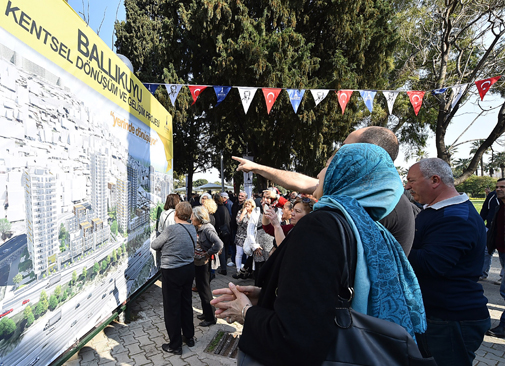 İzmir Büyükşehir Belediyesi, Ballıkuyu Mahallesi'ndeki kentsel dönüşüm projesini tamamlayarak kamuoyuna ve bölge halkına tanıttı. Kültürpark İsmet İnönü Sanat Merkezi'nde gerçekleşen ve büyük ilgi gören tanıtım toplantıda konuşan İzmir Büyükşehir Belediye Başkanı Aziz Kocaoğlu, “Bizim bu işten belediye olarak hiçbir kar beklentimiz yok! Burada katlanarak yükselecek rantın tamamı, inşaat yapılma maliyeti hariç, sizlerin olacak. Belediye’nin kazancı da bu işin şerefi ve güzel bir kent, mutlu kentlidir” dedi.