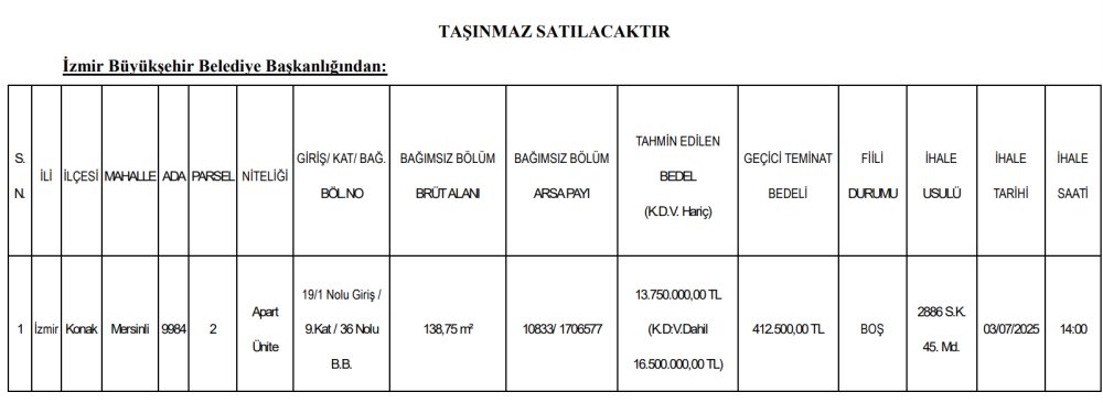 İzmir Büyükşehir Belediyesi, Konak ilçesinin Mersinli Mahallesi’nde yer alan denize sıfır olan apart daire niteliğindeki bir taşınmaz için satış ilanı yayımlandı. Resmi Gazete’de yayımlanan ilana göre, büyüklüğü 138 metrekare olan taşınmaz için Katma Değer Vergisi (KDV) dahil olmak üzere 16 milyon 500 bin TL muhammen bedel belirlendi. Satışa sunulan dairenin konumu, merkezi ulaşım ağına yakınlığı ve yatırım potansiyeliyle dikkat çekiyor. İhale 3 Temmuz Perşembe günü gerçekleştirilecek.