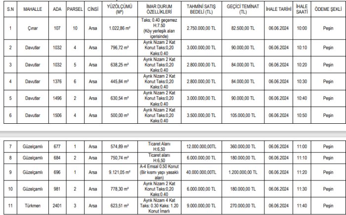 MADDE 6- Taşınmaz listesinin 7. ve 9. sırasındaki taşınmazlar kapalı teklif usulü ile satış ihalesi gerçekleştirilecektir.