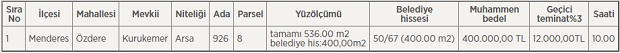 Menderes Belediyesi Özdere'de mülkiyetinin bir kısmının kendisine ait arsayı satışa çıkardı. Toplamda 536 metrekareden meydana gelen arsanın 400 metrekaresi belediye mülkiyetinde bulunuyor. 400 metrekarelik arsa için istenen fiyat ise 400 bin TL. Açık art