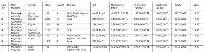 İzmir’in Menderes ilçesine bağlı Gümüldür, Özdere ve Akçaköy’de bulunan 7 adet arsa toplam 41.904.850 TL bedelle satışa çıkarılacak. Arsaların satış ihalesi 7 Mayıs Çarşamba günü gerçekleşecek.