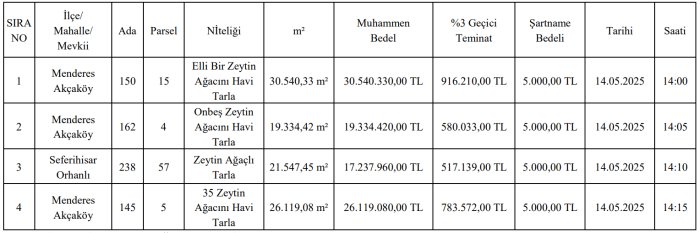 Menderes Belediyesi, 93 milyon TL değerindeki mülkiyeti kendisine ait 4 zeytinli tarlayı satışa çıkardı