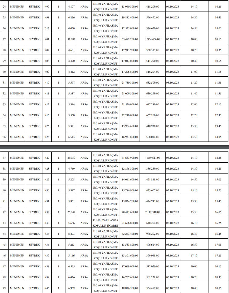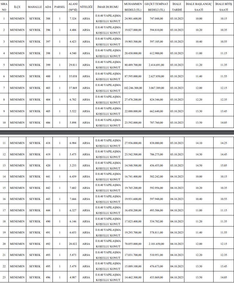 5. İhaleye katılacak isteklilerin ihale başlangıç tarihinden bir mesai günü önce 03.10.2023 tarihindeki ihaleler için en geç 02.10.2023 Pazartesi günü saat 15.00, 04.10.2023 tarihindeki ihaleler için en geç 03.10.2023 Salı günü saat: 15:00, 05.10.2023 tarihindeki ihaleler için en geç 04.10.2023 Çarşamba günü saat:15:00, 06.10.2023 tarihindeki ihaleler için en geç 05.10.2023 Perşembe günü saat:15:00’a kadar teklif zarflarını Camiikebir Mah. Şehit Kemal Caddesi No:1Menemen /İzmir adresinde bulunan belediyemizin Emlak ve İstimlâk Müdürlüğüne vermeleri şarttır. Belirtilen saatten sonra gelen teklifler ve posta ile başvurulması halinde postadaki gecikmeler kabul edilmeyecektir.