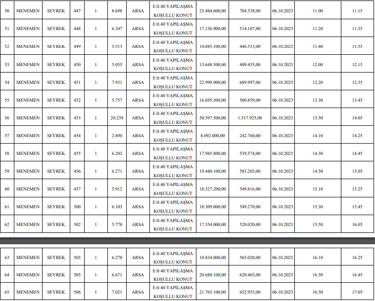 Menemen Belediye Başkanlığı, Villakent'te bulunan 65 adet arsayı kapalı teklif usulüyle satışa çıkardı. 0.40 emsal konut imarlı arsaların toplam satış bedeli 1 milyar 647 milyon TL olarak belirlendi.