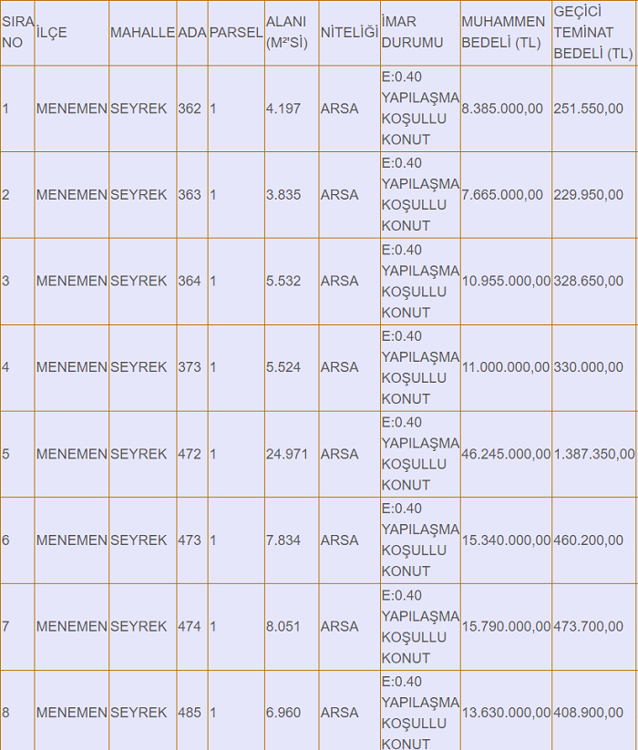 Menemen Seyrek'te 580 dönüm villa imarlı arsayı satışa çıkaran, 252 dönümünün satışı gerçekleştiren Menemen Belediyesi, 628 milyon 435 bin lira değerindeki 37 parseli daha satışa çıkardı. Arsaların kapalı teklif ihalesi 27 Martta gerçekleşecek.