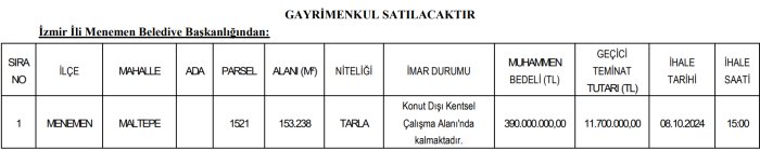 İzmir’in Menemen ilçesinde bir adet tarla 390.000.000 TL bedelle satışa çıkarılıyor. İhale 8 Ekim Salı günü gerçekleşecek