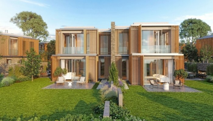 İkiz ya da müstakil villalar, ahşap ve taş gibi doğal malzemelerle dikkat çeken cepheler, etkileyici bir ambiyansı da gözler önüne seriyor.