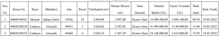 Ankara Çevre Şehircilik ve İklim Değişikliği İl Müdürlüğü Başkent Milli Emlak Dairesi Başkanlığı, Ankara’nın Çankaya ilçesinde (2) ve Mamak (1) ilçesindeki konut alanı imarına sahip avantajlı arsaları 85.117.500 TL’ye satışa çıkardı