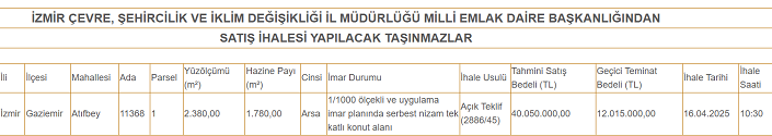 Çevre, Şehircilik ve İklim Değişikliği Bakanlığı Milli Emlak Daire Başkanlığı Gaziemir Atıfbey mahallesinde yer alan 2.360 metrekarelik konut imarlı arsayı açık artırmayla satışa çıkardı. İhalesi 16 nisanda gerçekleşecek arsanın değeri 40 milyon 50 bin TL olarak belirlendi.