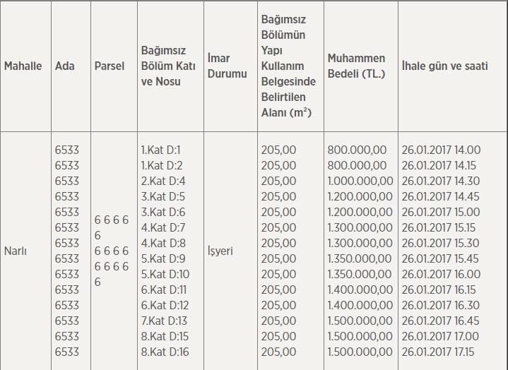 1- Aşağıda özellikleri belirtilen İzmir Narlıdere Belediyesine ait taşınmazlar ihale ile satılacaktır. İhale “Mithatpasa Cad. No:447/C NARLIDERE/İZMİR”adresindeki Narlıdere Belediye Binası 6. kattaki Encümen Odasında, Belediye Encümenince 2886 sayılı Devlet İhale Kanunu’nun 35/a maddesi uyarınca “Kapalı Teklif Usulü” Açık Artırma suretiyle yapılacaktır. Şartname bedeli 250,00 (ikiyüzelli TL)olup, Narlıdere Belediyesi İmar ve Şehircilik Müdürlüğü’nden (3.Kat) temin edilebilir.