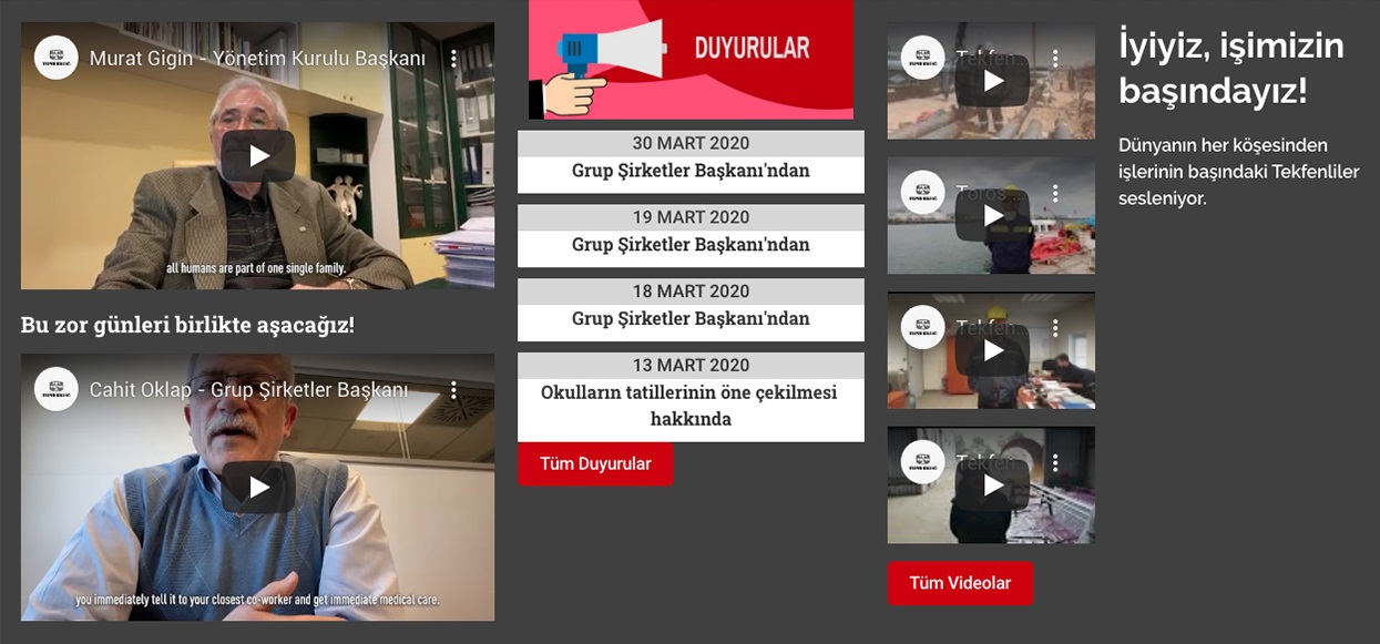 Tekfen Holding’in kurumsal yayını T Bülten Online’ın özel sayısında üst düzey yöneticiler ile yurt içi ve yurt dışında işlerinin başında olan Tekfenlilerin videolu mesajları ve keyifli aktivite önerileri bulunuyor.