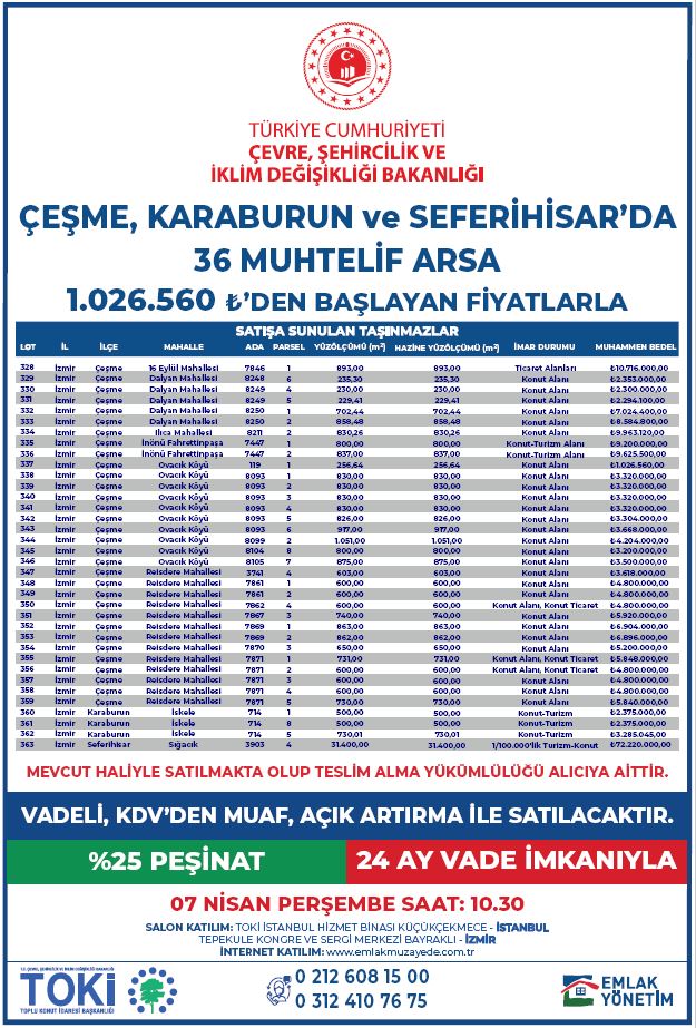 TOKİ, Çeşme, Karaburun ve Seferihisar'da yer alan 36 arsayı açık artırmayla satışa çıkardı. Değeri 234 milyon 691 bin TL olan arsaların açık artırma ihalesi 7 Nisan perşembe günü gerçekleşecek.