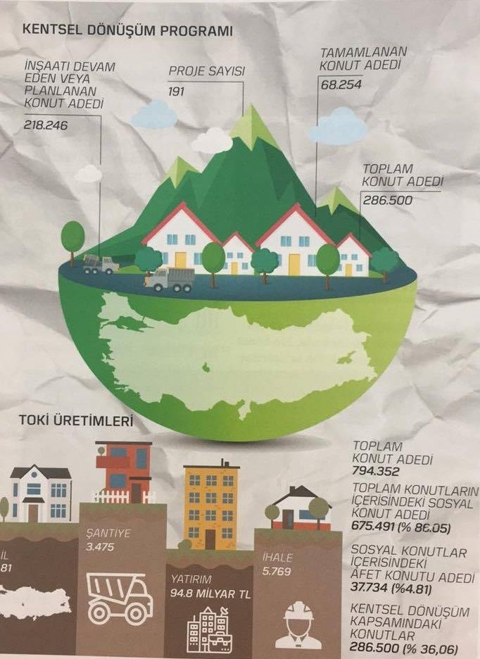 Deprem olasılığının sürekli gündemde olduğu ülkemizde, kaçak ve sağlıksız inşa edilmiş binaların ortaya çıkardığı riskli yapı stokunun fazlalığı, kentsel dönüşümü, yapılaşma olgusunun merkezine taşıdı. Yerel yönetimlerle birlikte yürüttüğü çalışmalarla afetlere karşı riskli ve yapı ömrünü tamamlamış konut stokunu yenileyen TOKİ, bugüne dek dönüşüm alanlarında ikamet eden 1 milyondan fazla kişiye yenilediği konutlar ile güvenli yapılarda güvenli yaşam imkanı sunuyor. TOKİ, 2002- 2017 (ilk 6 ay) arasında yaklaşık 800 bin konut inşa etti. Yerel yönetimlerle işbirliği içinde yürütülen kentsel dönüşüm programları kapsamında, tamamlanan, inşası süren ve inşa hazırlık aşamasında olan toplam 286 bin 500 konutluk 191 kentsel dönüşüm projesi başlatıldı. Söz konusu projeler içinde yer alan 68.254 konut tamamlanarak hak sahiplerine teslim edildi, 218.246 konutun inşa süreci devam ediyor.