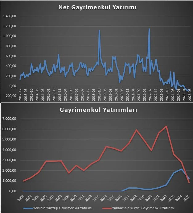 Bu durumun neticesi ise "Net Gayrimenkul Yatırımı" grafiğinde daha da dramatik bir şekilde görülüyor. Yıllardır artı veren net yatırım, 2024 sonlarından itibaren hızla eriyerek 2025'te eksiye, yani net çıkışa dönmüş durumda.