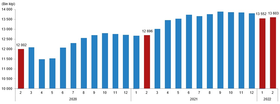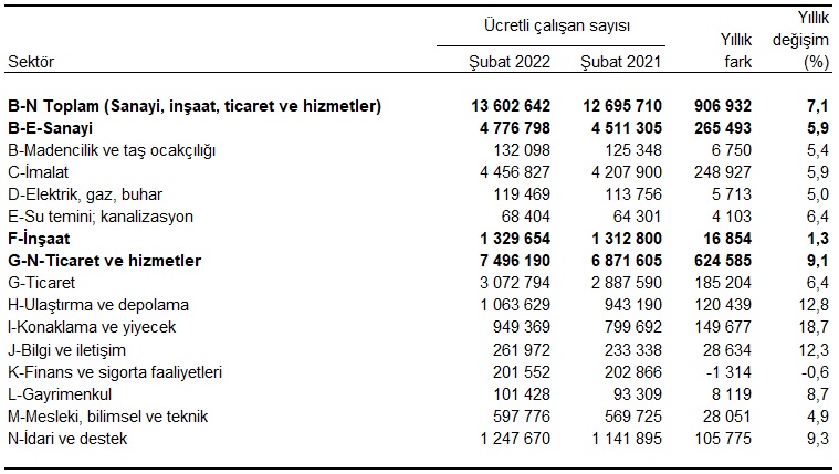 Sanayi, inşaat ve ticaret-hizmet sektörleri toplamında ücretli çalışan sayısı 2022 Şubat ayında bir önceki yılın aynı ayına göre %7,1 arttı. Ücretli çalışan sayısı bir önceki yılın aynı ayında 12 milyon 695 bin 710 kişi iken, 2022 yılı Şubat ayında 13 milyon 602 bin 642 kişi oldu.