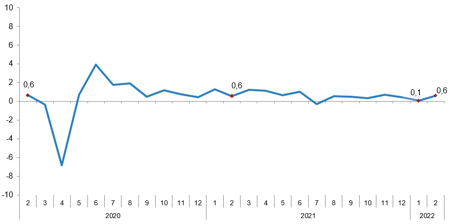 Sanayi, inşaat ve ticaret-hizmet sektörleri toplamında ücretli çalışan sayısı 2022 Şubat ayında bir önceki aya göre %0,6 arttı.