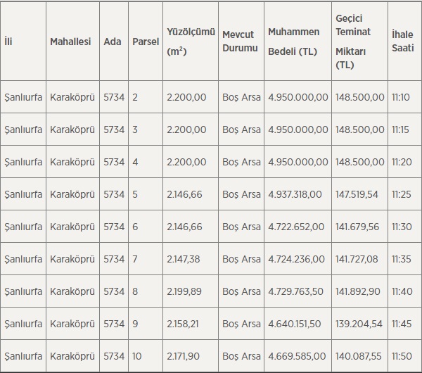 Şanlıurfa Büyükşehir Belediyesi Karaköprü mahallesinde 9 parsel arsayı satışa çıkarıyor. Büyüklükleri 2 bin 146 ile 2.200 metre arasında değişen 9 arsanın toplam satış bedeli 43 milyon lirayı geçiyor. Altın değerindeki arsaların etrafında, okul, hastane, 2 adet alışveriş merkezi bulunuyor. Arsaların ihalesi 22 aralıkta gerçekleşecek.